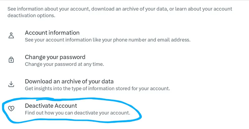 Deactivate – When you deactivate your twitter account it isn’t delete, the deactivation helps you can do temporary disabled your account not permanent, it is remove from search and not anyone can see your account until you can’t reactive your twitter or X account, when you reactive account you can see your accounts all data.