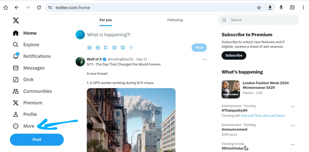 First, Open web browser in your device and search Twitter or X Login and click on this link https://twitter.com and login your Twitter (X) account, after login in twitter or X account you see this type of interface, like this image.